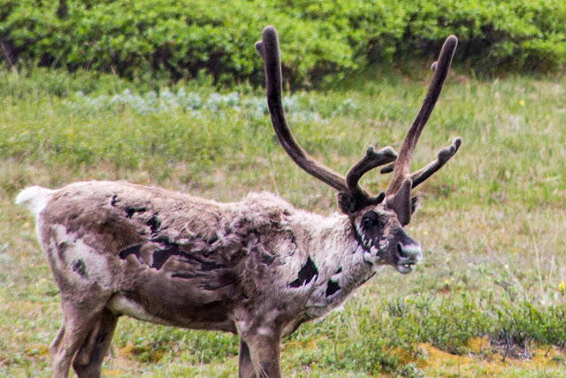 We spotted several Caribou. They are often called Reindeer. It still has fur or “velvet” on the horns. The velvet will come off during “rutting” season when the deer rub it off.