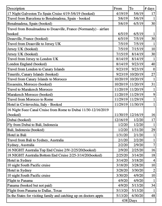 We have updated our itinerary. It is coming together nicely. I have been adding other countries for our second round after visiting our home country in the summer of 2020. Our first year is 30 days here, 30 days there and after realizing how much we have to travel in between and pack and unpack, we decided on our second year, we will stay longer, as long as the visa will allow.