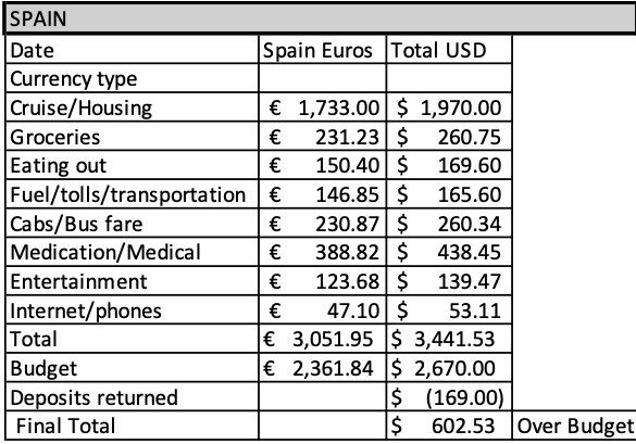 We finally have the final numbers for our Spain trip. I have detailed everything and converted from Euros to US dollars. Some of the conversions are a little off since the state of the Euro changes so frequently and some of this was paid in advance. We went over budget by $600. However, $438 was for my little hospital visit! In my budgeting, we found many items we didn’t think about budgeting for, such as entertainment, additional transportation, other than cab from the airport and back, and our internet usage. Sure we have wireless while in the holiday/vacation home but not while out and about. We use our maps a lot when walking or driving so we can find our way back to the holiday home. I need to remember to use the offline maps more frequently. All in all, I think we did pretty good for our first month. This does not include the cruise so transportation to Spain is not included. Didn’t realize we could live in Spain for 30 days for less than $3500. I’ll revise our budget to include items I didn’t have for Spain on future locations.
