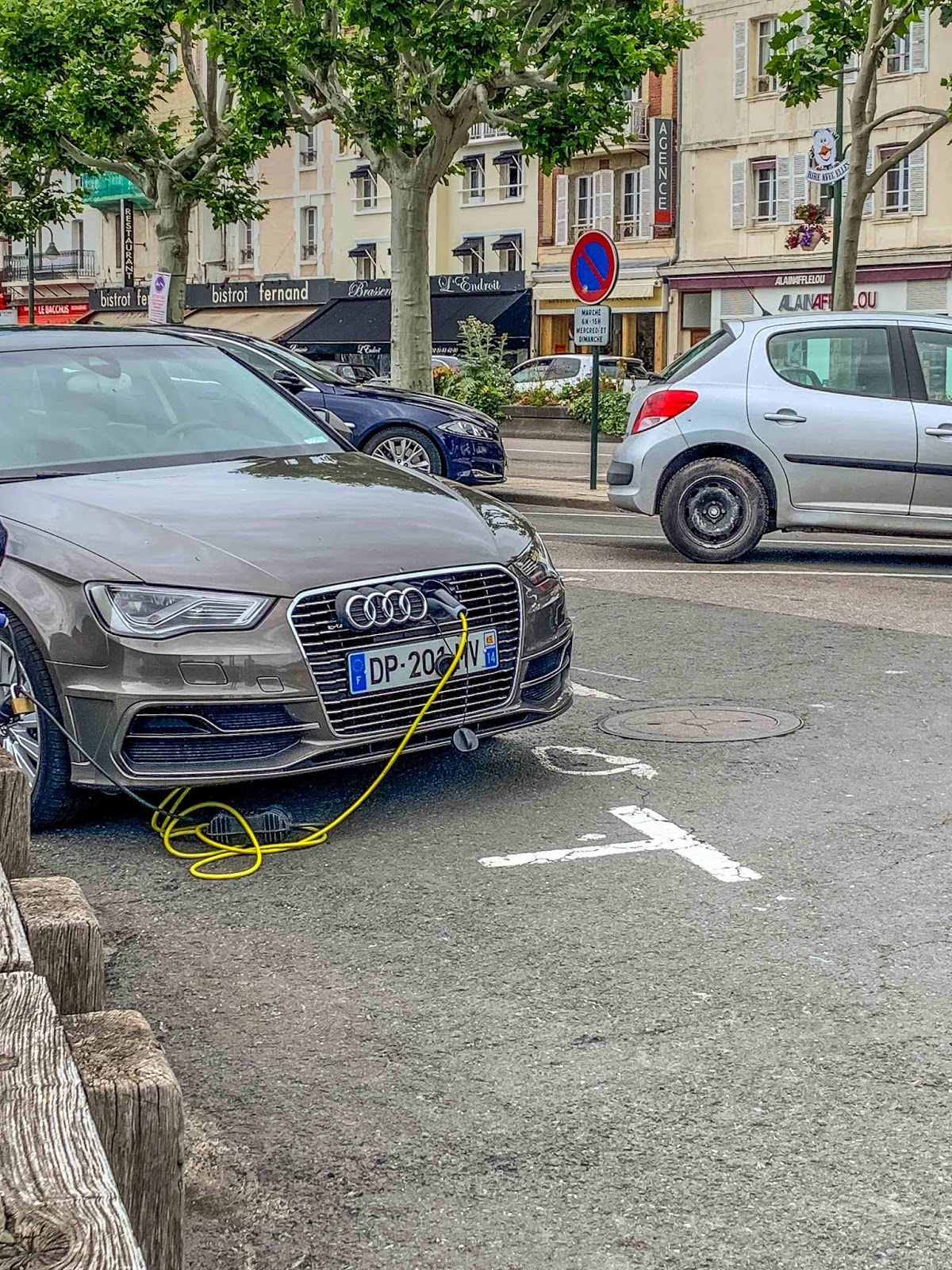 | Many cars were plugged up. There are a multitude of “refill stations’ and they are free. Electric and very tiny cars are in abundance here. |