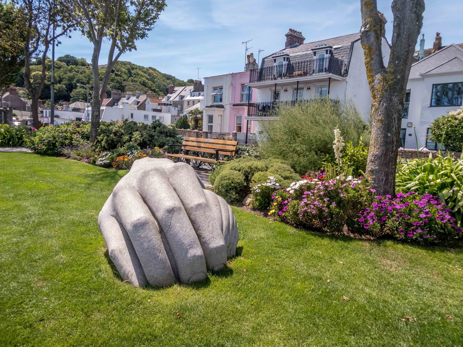 | Various sculptures around the area of St. Aubin in a park area. |