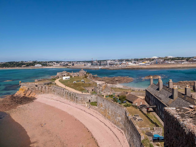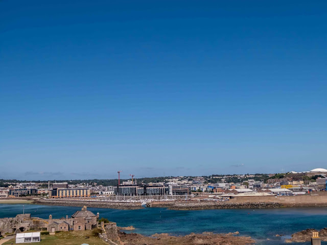 | Overlooking the grounds of the castle from the top tower. St. Helier just ahead |