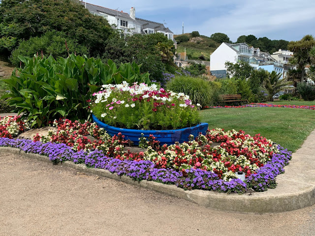 | A host of flowers in a cute little boat line the walkways in Grouville, Jersey Island |
