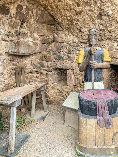 | A carving of tradesmen in the castle. Civilians lived and worked alongside soldiers in the castle. Some were servants while others were visiting tradesmen such as these. |