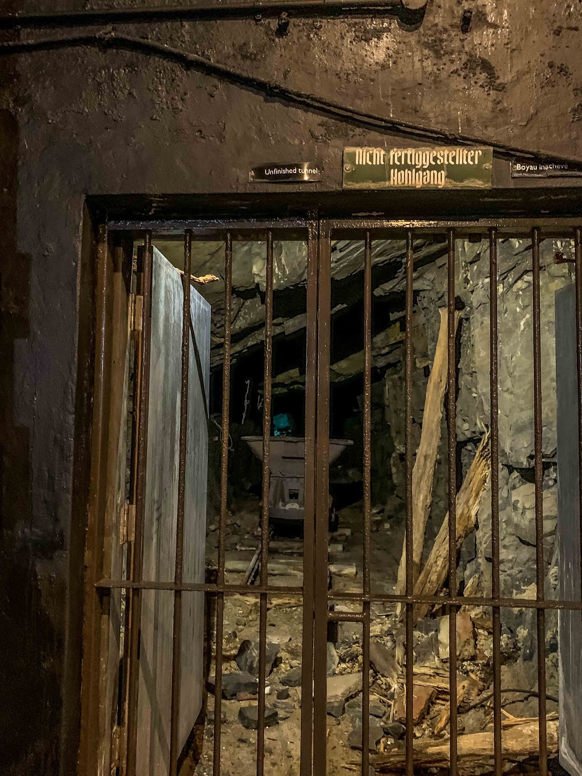 | One of many unfinished tunnels blocked off. The tunnels were fragile when being built and at times rocks would fall on the workers who brought their own head protection if they could. |