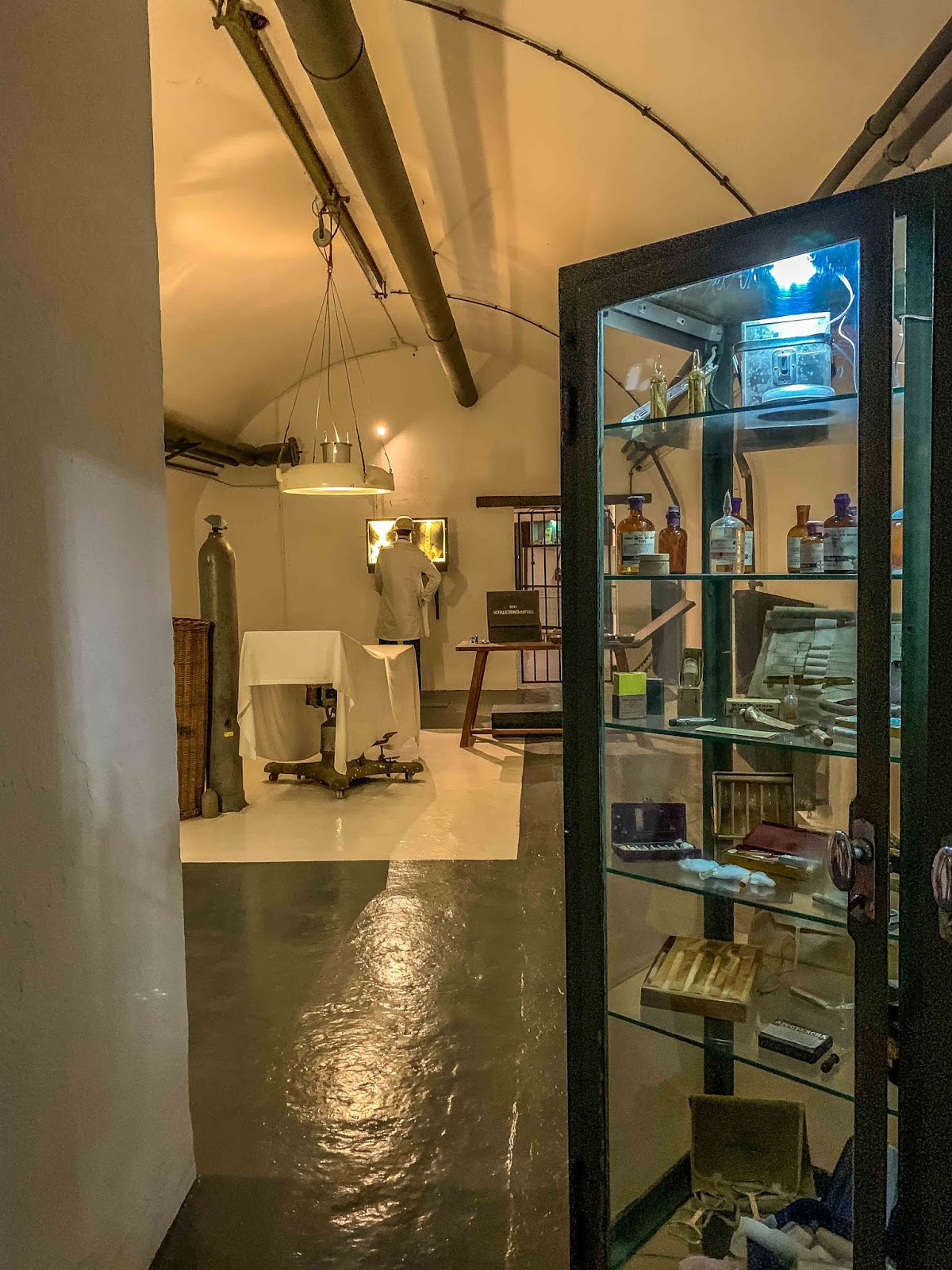 (No heat was on today as we were really cold by the time we finished the tour.) A system of gas-proof doors was installed to maintain a clean airflow in the tunnels, and a fully equipped operating room (theatre as its called here in Jersey) was installed.