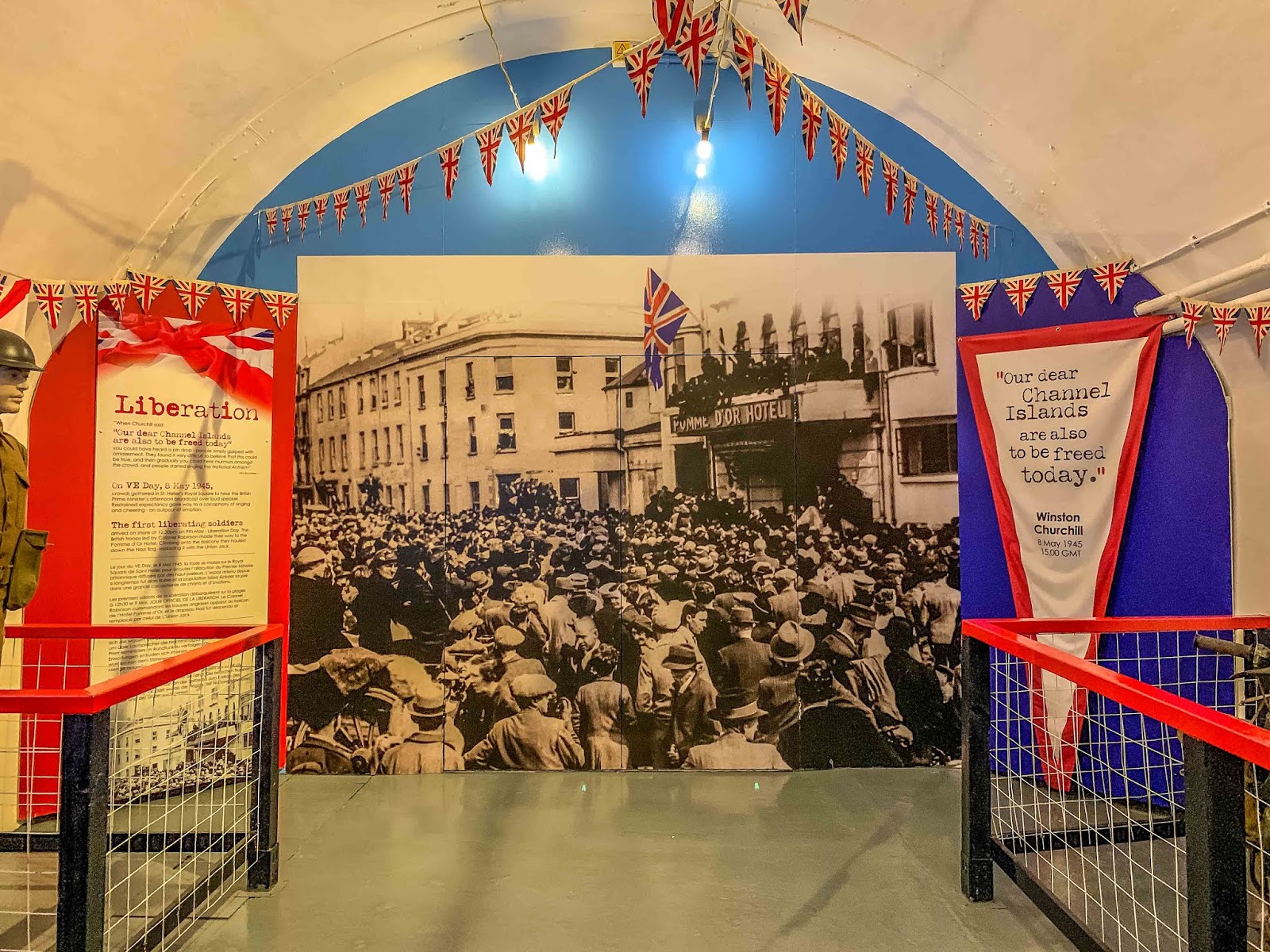 | Many pictures such as this were stationed around the tunnels to tell the story. This was Liberation day when the British flag replaced Hitlers German flag |