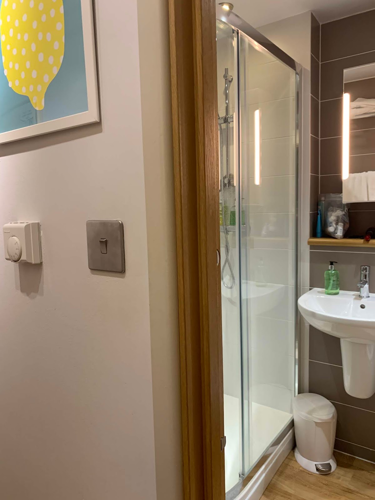 | The light switches are on the outside of the bathroom. Not sure why they did that. |
