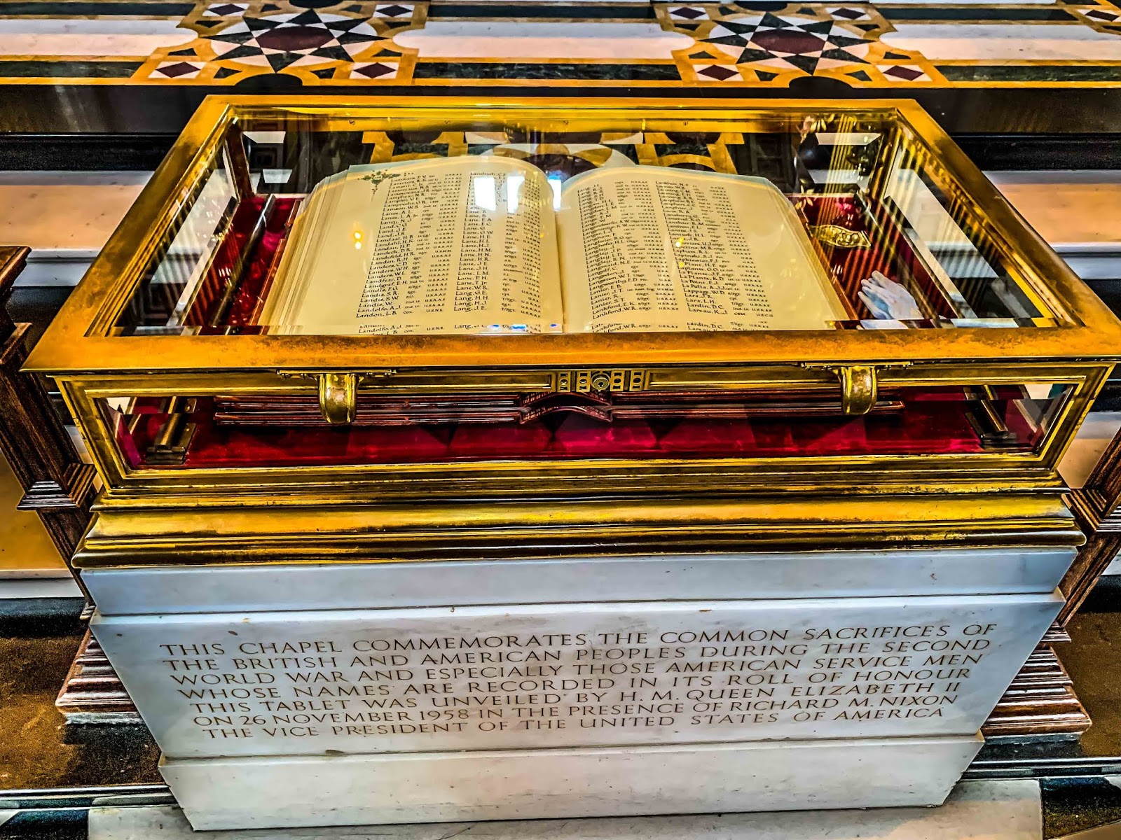 The names of the British and Americans who lost their lives during WWII are recorded in this tablet. This was unveiled in 1958 by Queen Elizabeth II and VP Richard Nixon