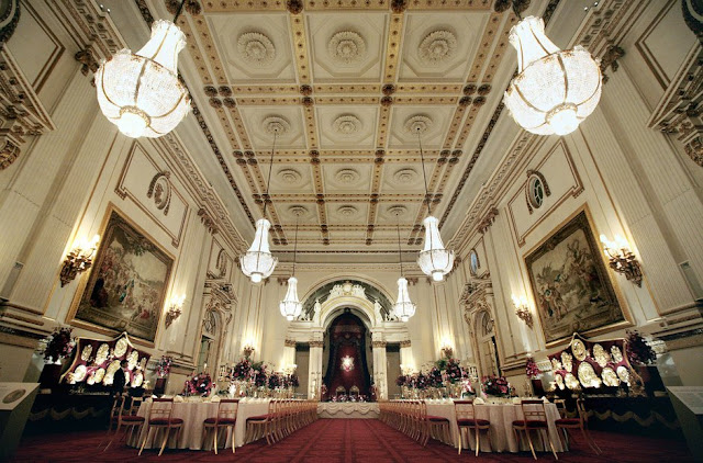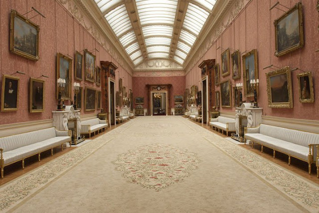 As described in many publications, perhaps the grandest of all the State Rooms in Buckingham Palace, is the White Drawing Room. It is often used for audiences with the monarch and small gatherings. Ahead of larger events, the room is used for key guests to be presented to the Queen before everyone heads into a bigger State Room to mingle. It had a tall white ceiling and the walls were white with gold inlay. There were two sets of double mirrored doors. They called it an escape route to disappear from the guests.