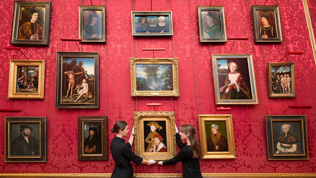 | Stock Photo – Queens collection of artwork and paintings. Notice the use of white gloves for handling. |