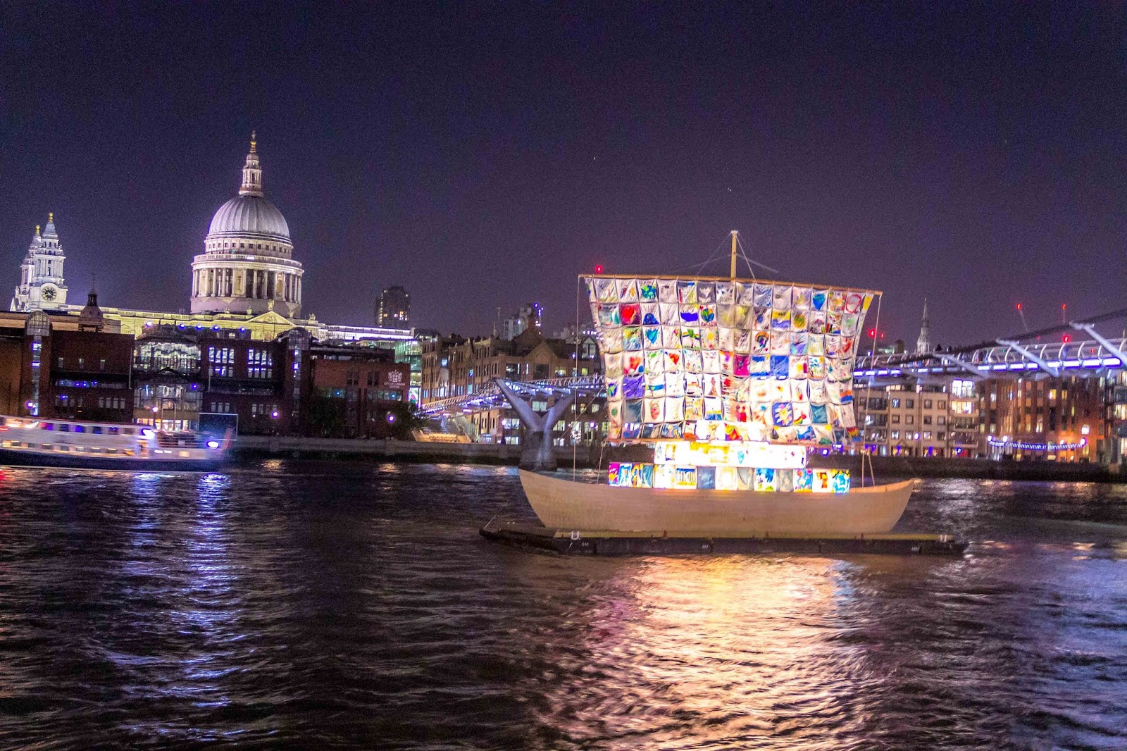 | I’m not sure what this little sailboat was about but it looked like children’s paintings on cloth. It was cute in light. |
