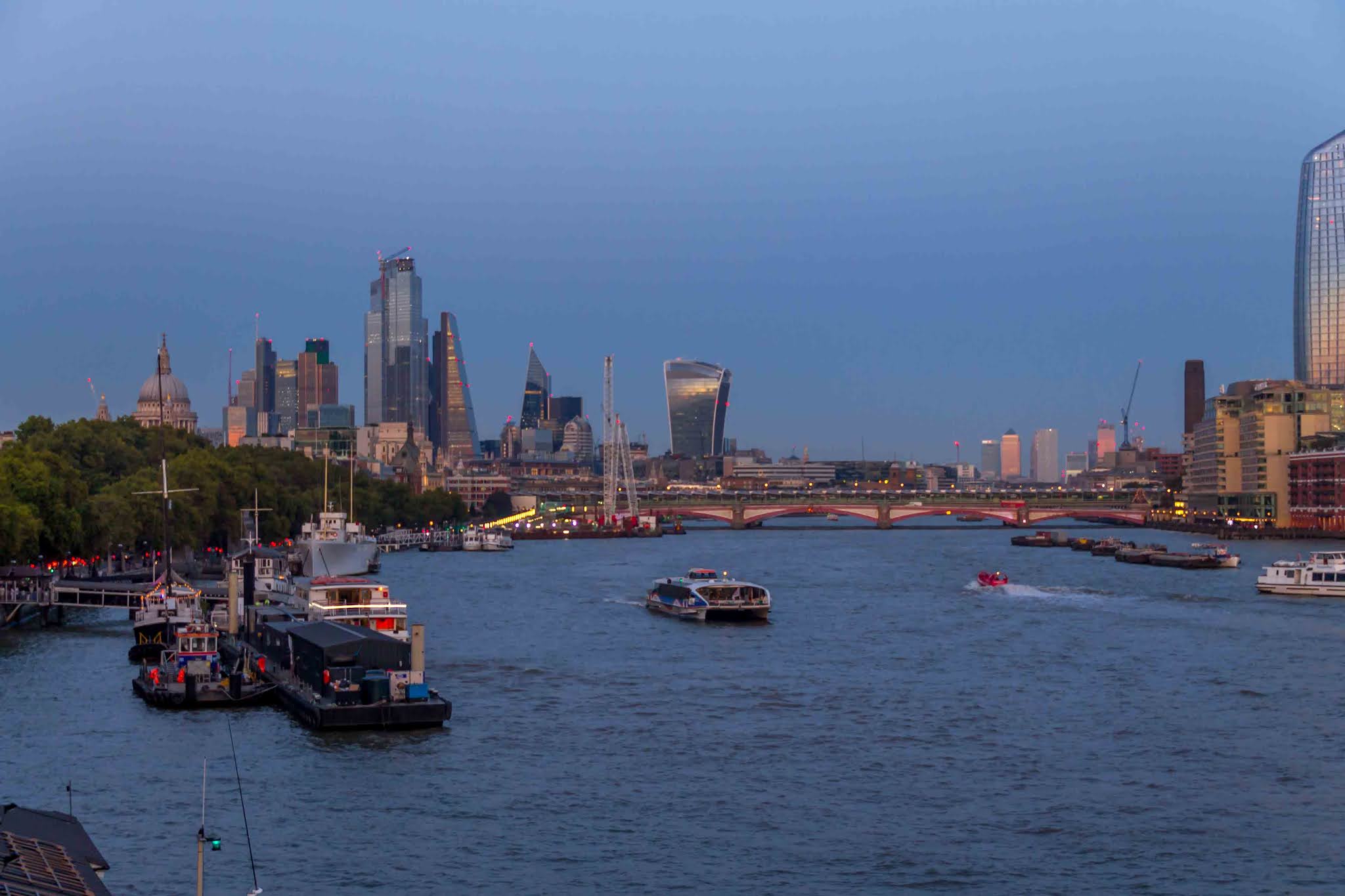 | Just after sunset, the Thames river and the London bridge starting to light up. |
