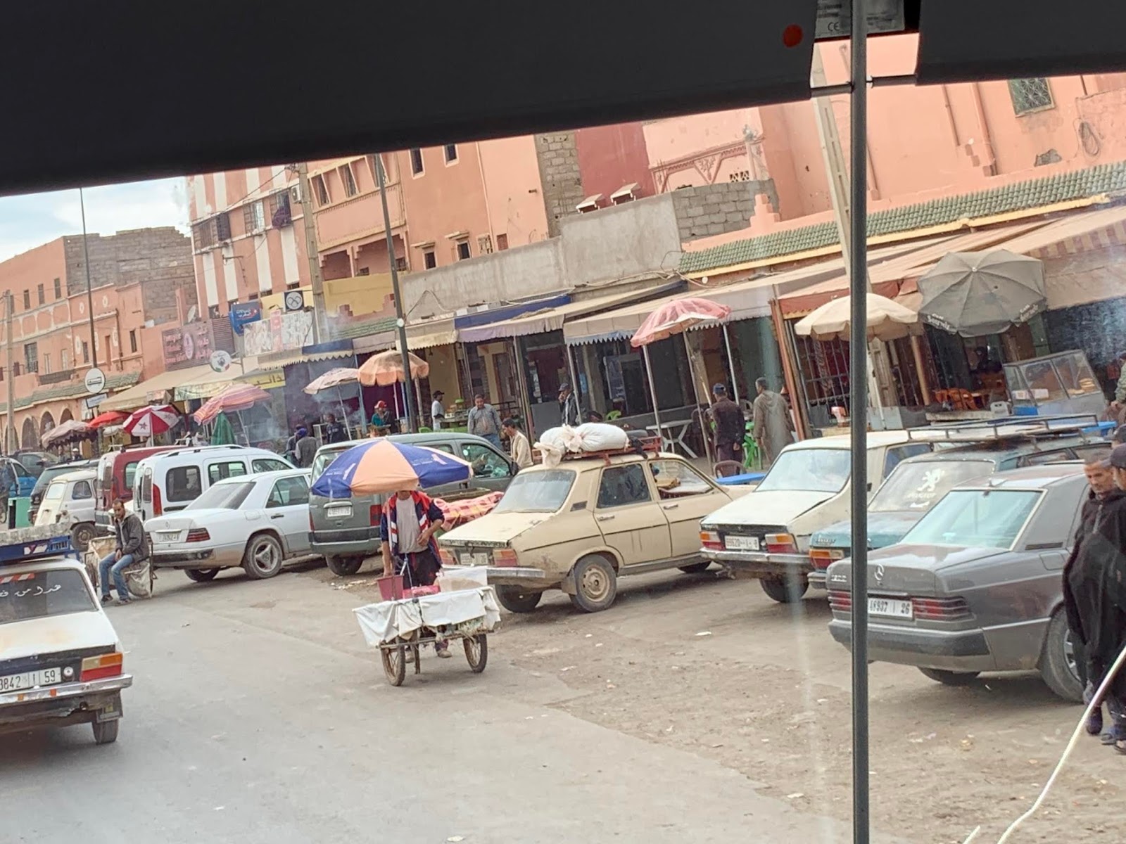 We had to pay 5 MAD/dirham (.52 cents USD) per bag. Guess that makes up for the €150 Euros for one bag? Not even close! I’m still reeling over that one. The bus ride was 3 hours. It really wasn’t bad. We had the first row of seats so we had a good view. And boy did we see a lot! At first we were amazed at how desolate the land was. So dry and very little, if any, greenery. The houses were anywhere from a decent looking stucco home/apartment to a dilapidated, curtain for a door hole in the wall.