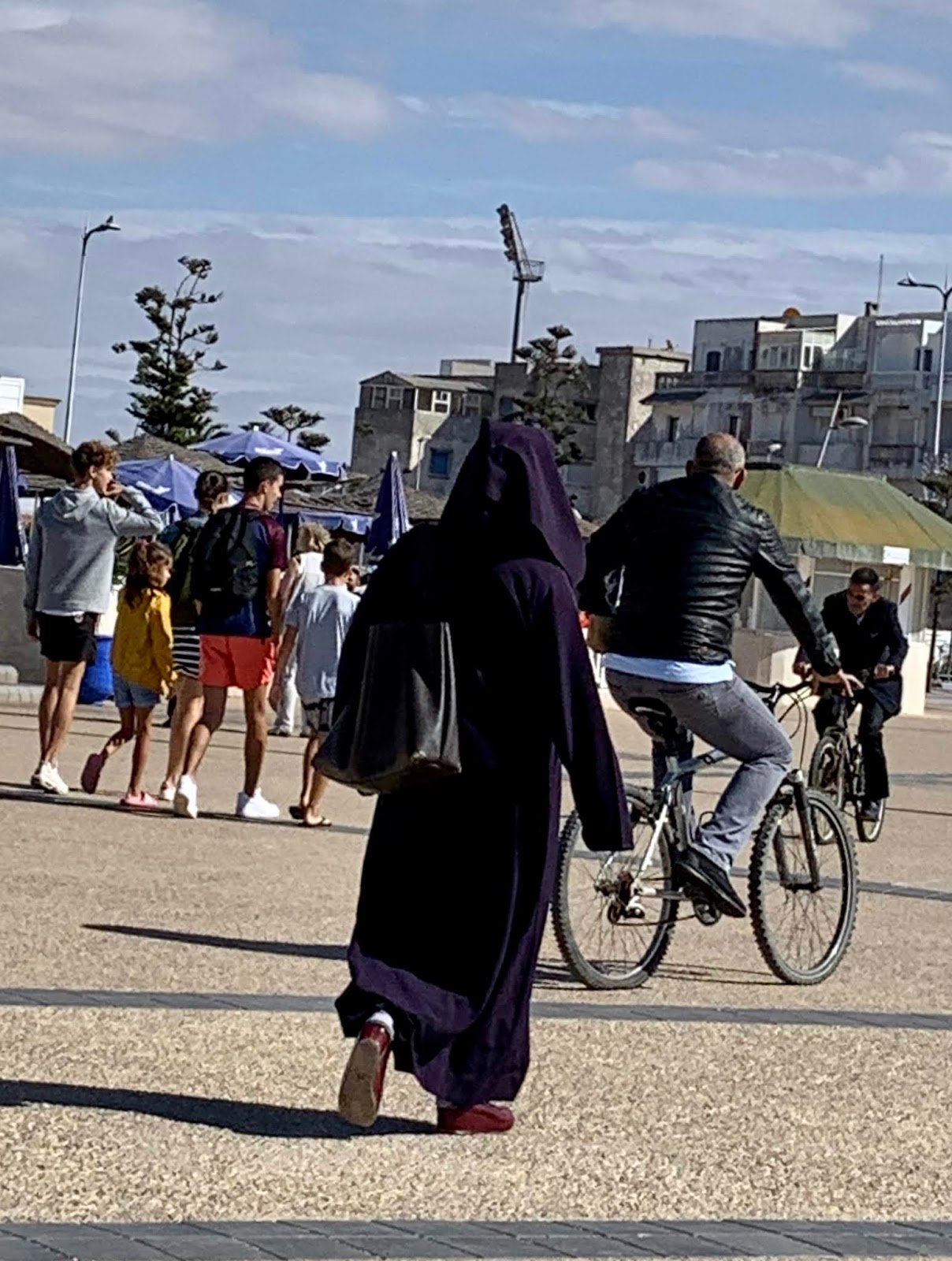 | Bicycles or walking. Also, this person was fully dressed in full length Burqa with a Niqab, meaning her face is fully covered. You could only see her eyes. She was wearing clogs on her feet. |