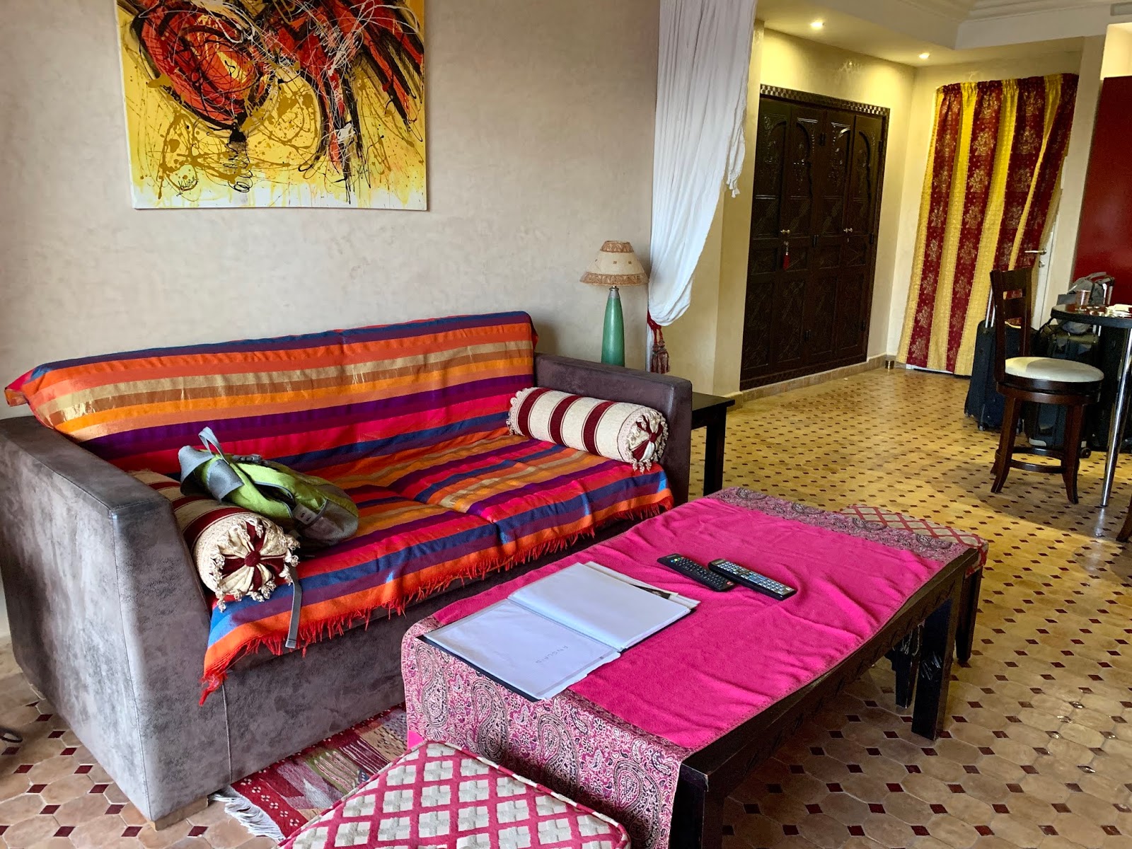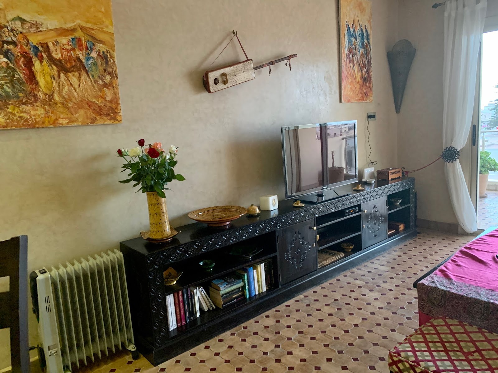 | Moroccan furniture in living area. Satellite TV, wireless internet cost us $20 USD for the month. |