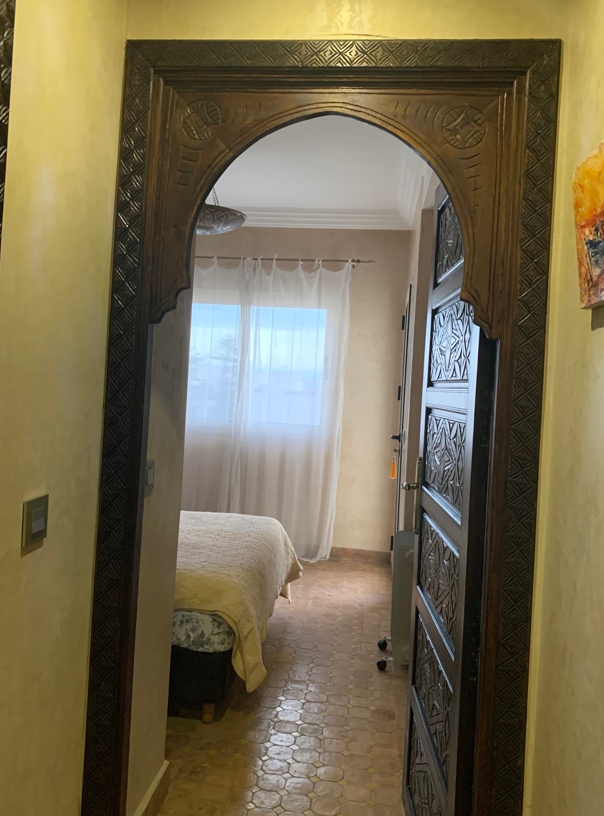 | Moroccan style door to bedroom. The doors and woodwork are heavy |