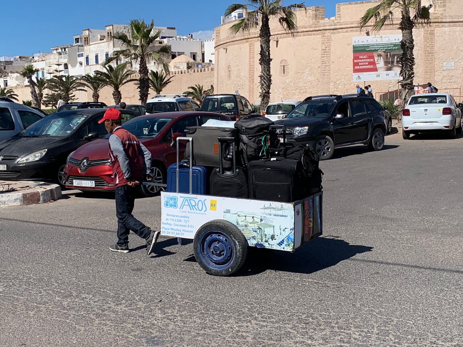 Now, to settle up with our walking taxi driver. We were told to make sure you bargain and set the price for anything you buy before you leave. This includes items at the Medina that we’ll write about once we attend. We settled on €3 for him to carry our luggage. We asked him, will you take Euros and he said yes. After we arrived and he saw that we had Dirham, he insisted on Dirham so Chuck gave him 20 Dirham and he begged for more so we ended up giving him 30 Dirham. $3 USD. A taxi was 7 Dirham/$0.72 USD.