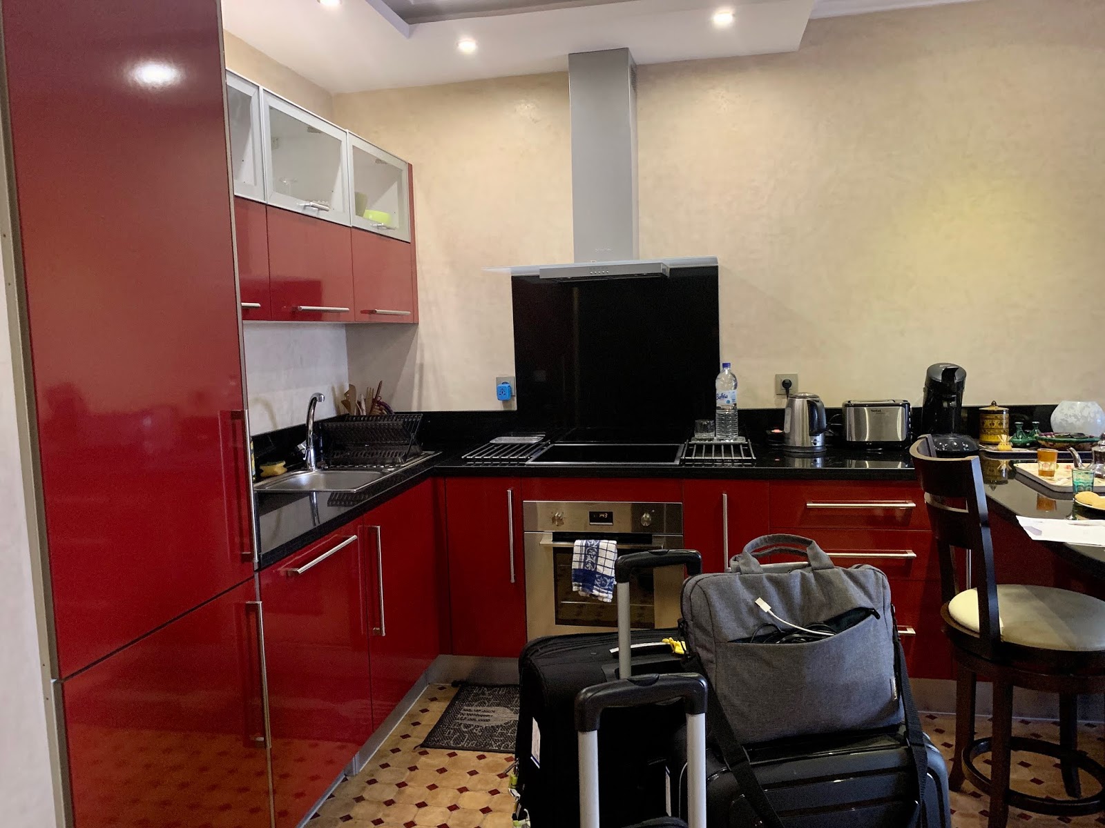 Bouchra, our representative arrived and she walked us up to the apartment. Its on the 3rd floor (elevators, no stairs!) with the view of the ocean. Not oceanfront but we have a really good view from the side. Bouchra spoke good English but her main language is french so she struggled some. She was really nice and accommodating. Showed us everything about the apartment and how things work. We have her on whatsapp now so we can communicate with her if necessary. We asked about the market and asked if there was something close or is Carrefour (a major french chain) the only one. She informed us that if we bought local, we would need to go to several different market places to get all we needed and it wasn’t efficient.