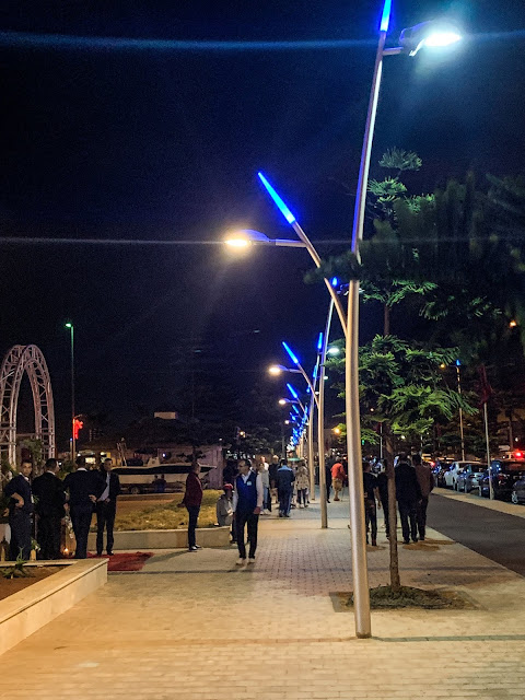 The night lights up in blue. Very pretty along the street. There was also a wedding happening here.