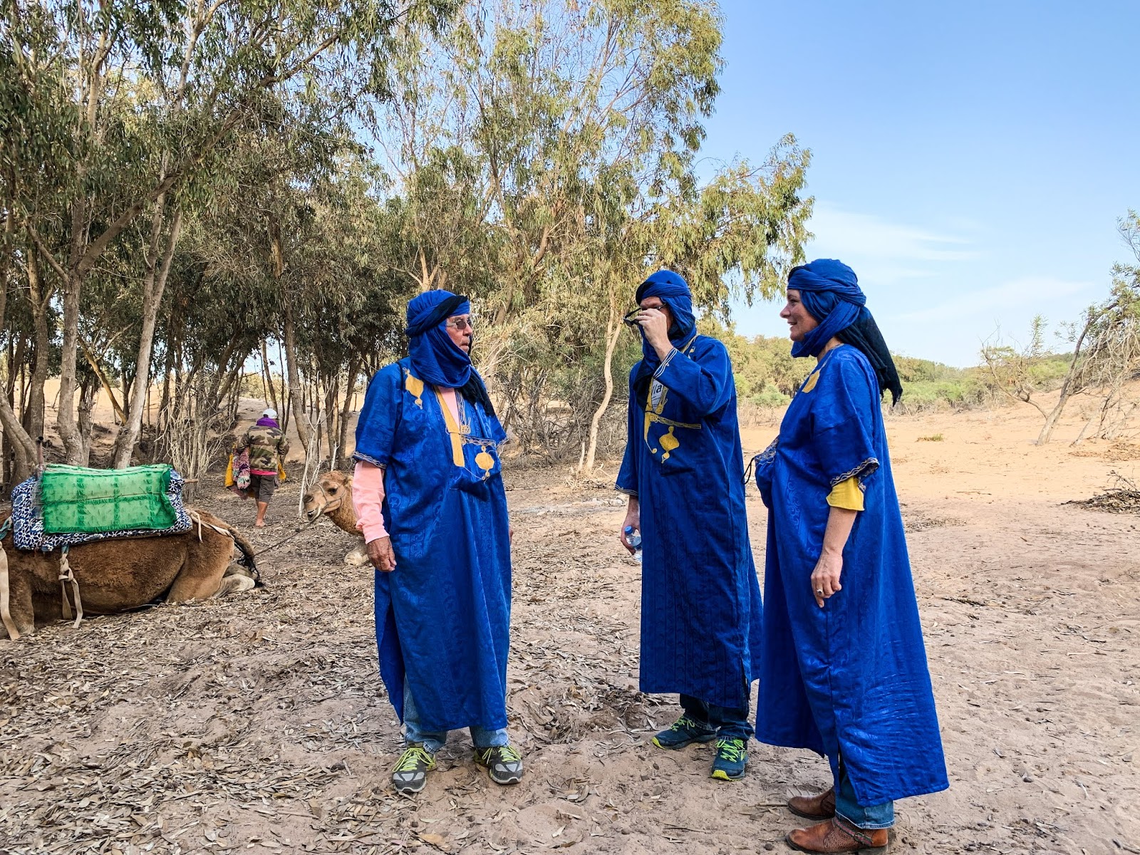 Chuck and the others standing around chatting. We are wearing a headscarf and a djellaba, a robe worn traditionally in Morocco by both men and women.