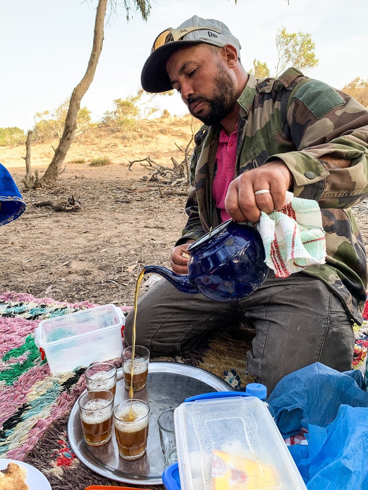 Mustafa, our guide and owner of the dromedaires, pours the mint tea to make a froth.