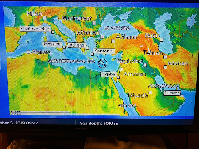 | Our path to this point from Civitavecchia, Italy and heading south to Aqaba, Jordan. This update is on our TV at all times. It also gives us sunrise/sunset daily and date and time. |