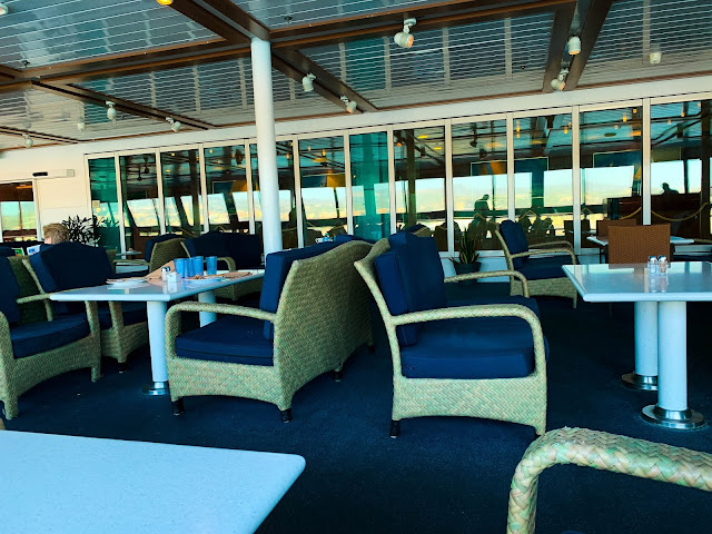 | Not only does this ship have inside dining but it also has a covered outside dining with these very comfy chairs. |