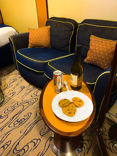 | Our welcome gift is warm cookies and a soda. This time we had a bottle of wine from our travel agent. A very nice gesture! |