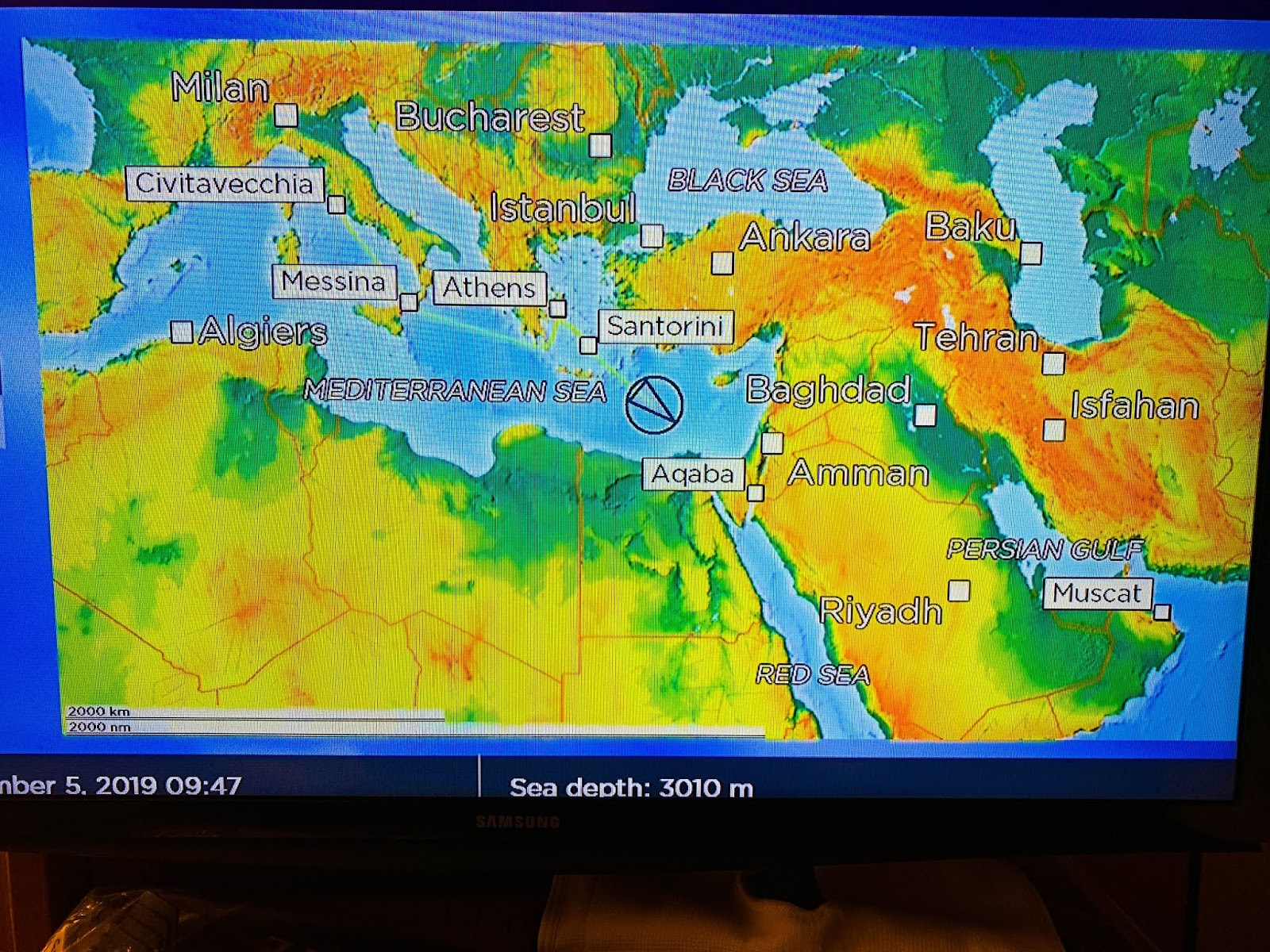 | Our path to this point from Civitavecchia, Italy and heading south to Aqaba, Jordan. This update is on our TV at all times. It also gives us sunrise/sunset daily and date and time. |