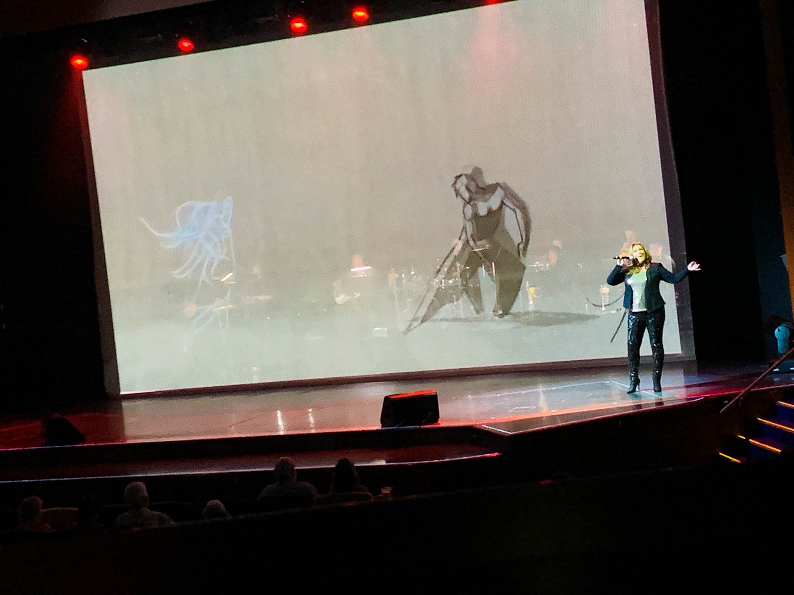 | With one of her songs and the the band backing her up, this graphical simulation was on the screen behind her, allowing her music to come to life. |
