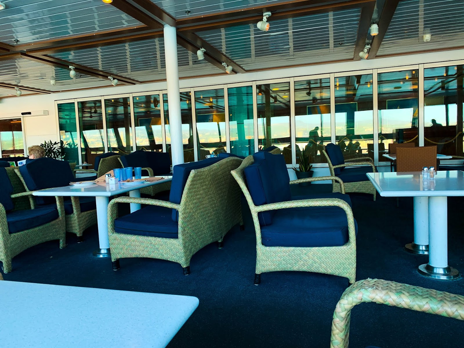 | Not only does this ship have inside dining but it also has a covered outside dining with these very comfy chairs. |
