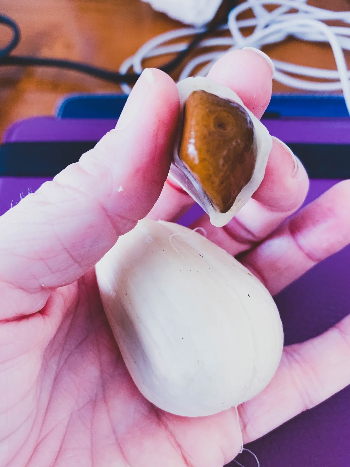 | Mangosteen – you eat the white meaty part and discard the shell and the large pit inside. |