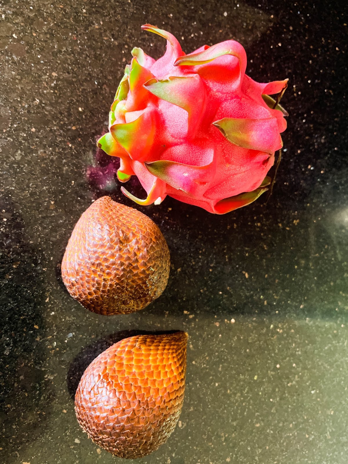 The fruit was called mangosteen. It was a white fruit with a large seed in the middle with a thick brown skin. It tasted like pineapple. It was nice and sweet. We also had a Balinese Pandan cake. It is a green sponge cake made from rice flower and pandan leaves that give it the sweetness and green color.