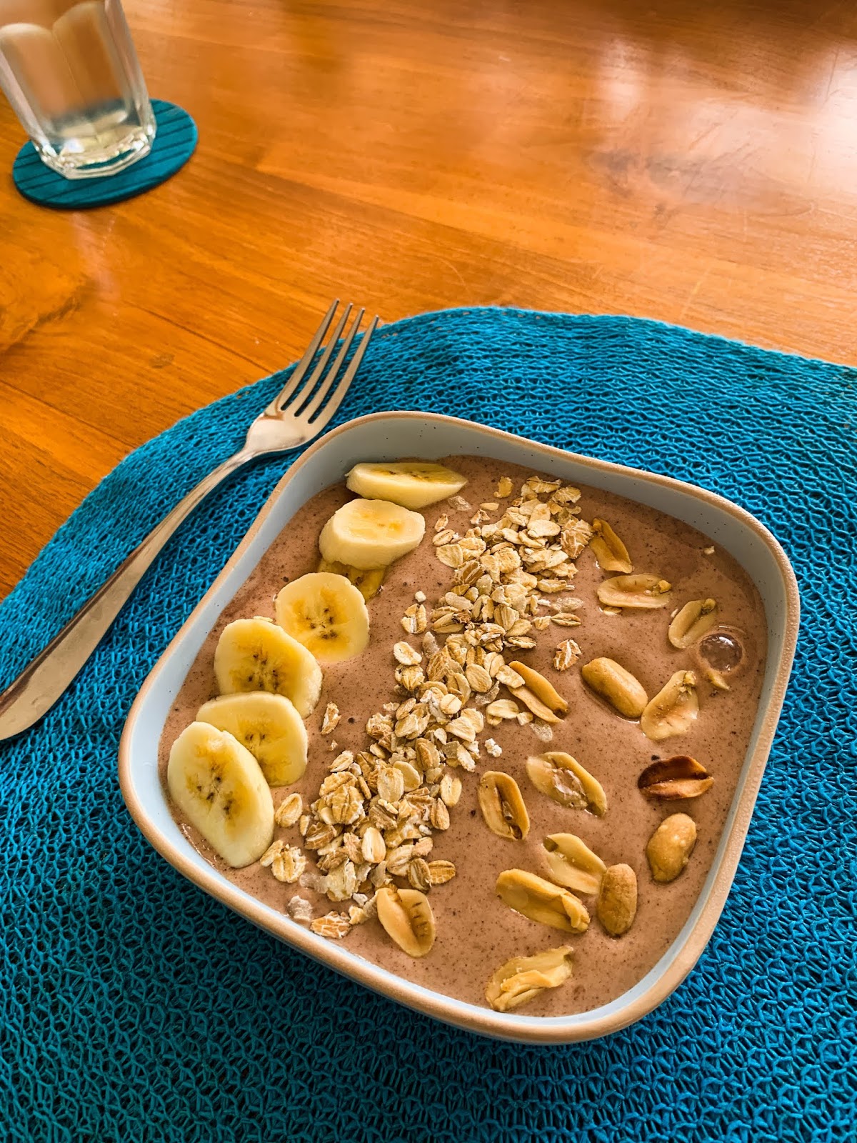 | A chocolate smoothie bowl with bananas and peanuts. YUM! |
