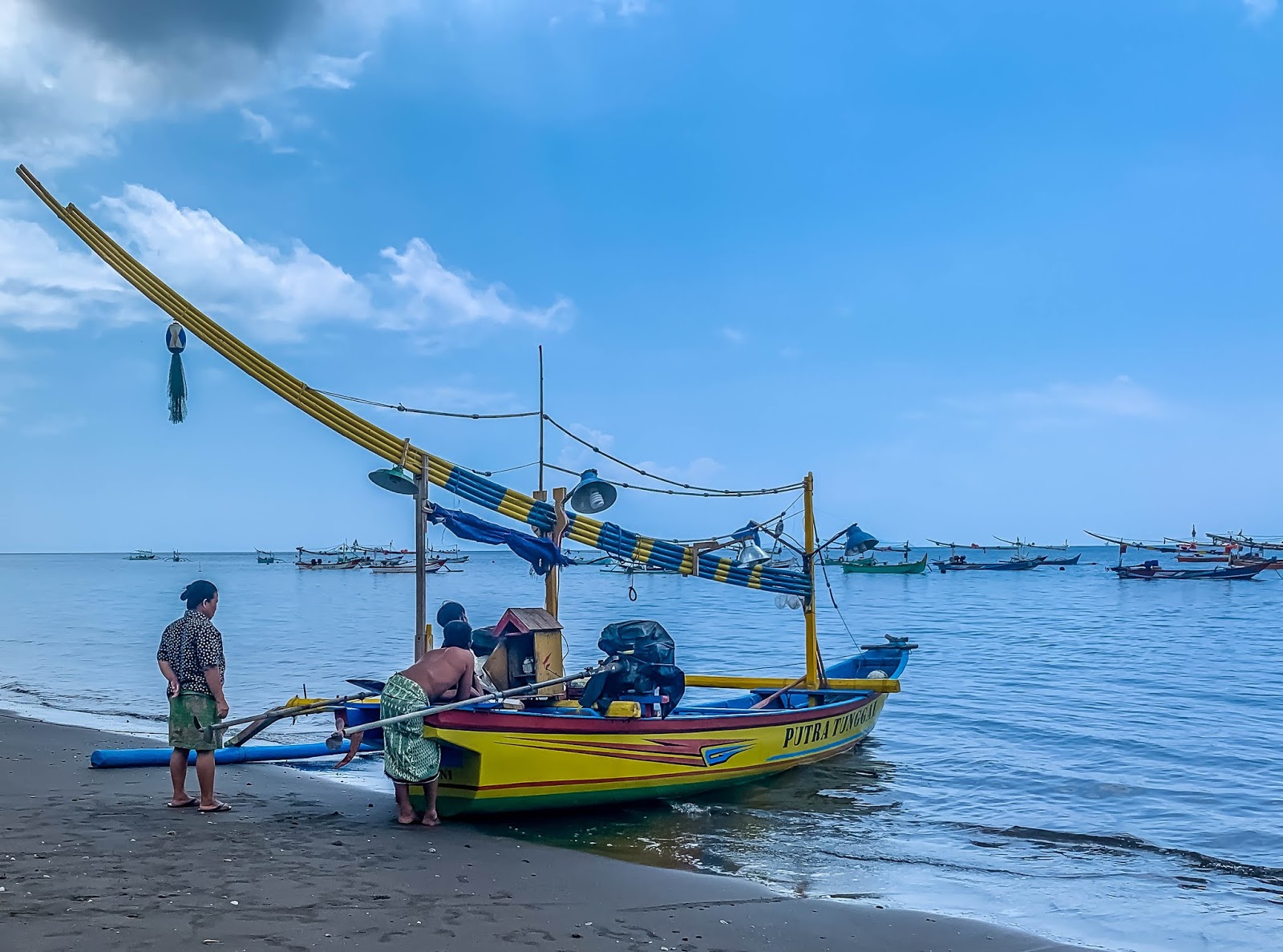 | Fishermen (with mom supervising) getting their jakung ready for the evening fishing expedition. They have generators and lights on them. |