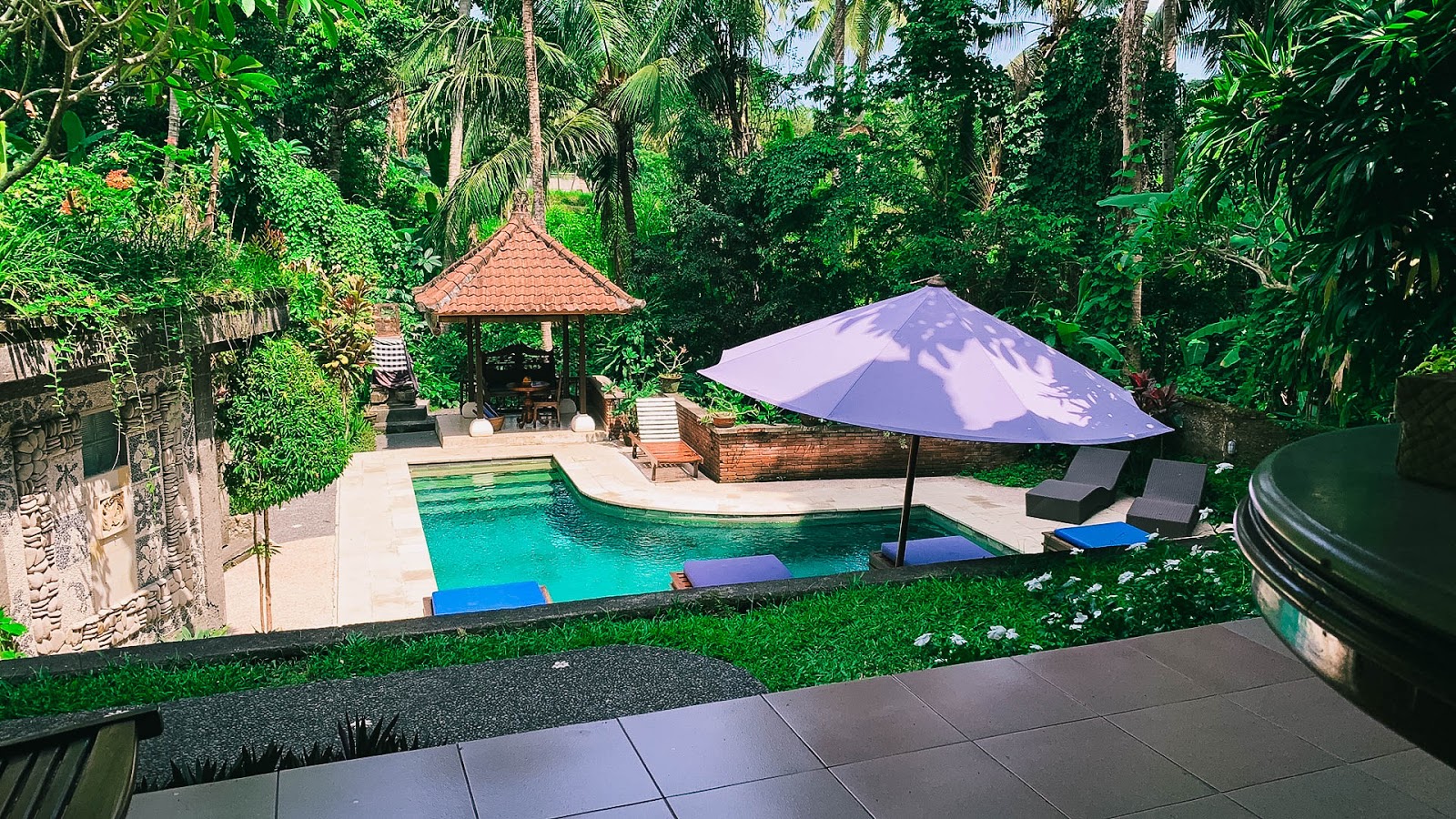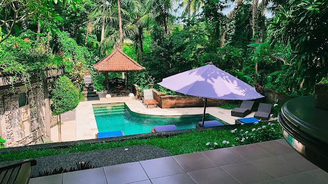 The place is really hidden in the back trees but it is nice and peaceful here. We have a one room villa with the patio out front with a table and chairs for eating breakfast. They’ll deliver that tomorrow morning at 9 am. The room is cute but quite a difference from our 3 room house with a private pool. We are right next to the pool so it almost looks the same looking outside.