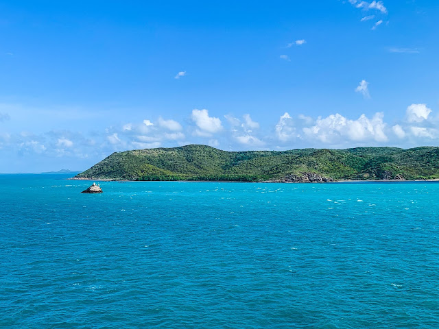We have reached the top North end of Australia. The channels were tight between the small hills or mountains in the water, so we slowed down and the captain had to do some tricky navigating, mostly due to the reefs in the area. We passed some beautiful mountains in between some reefs.