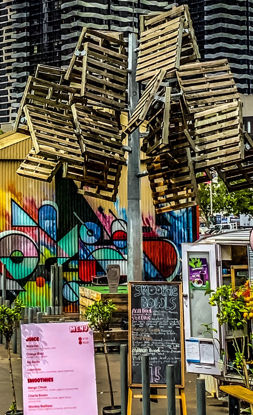 | Chuck liked these wooden pallets hanging in the air. |