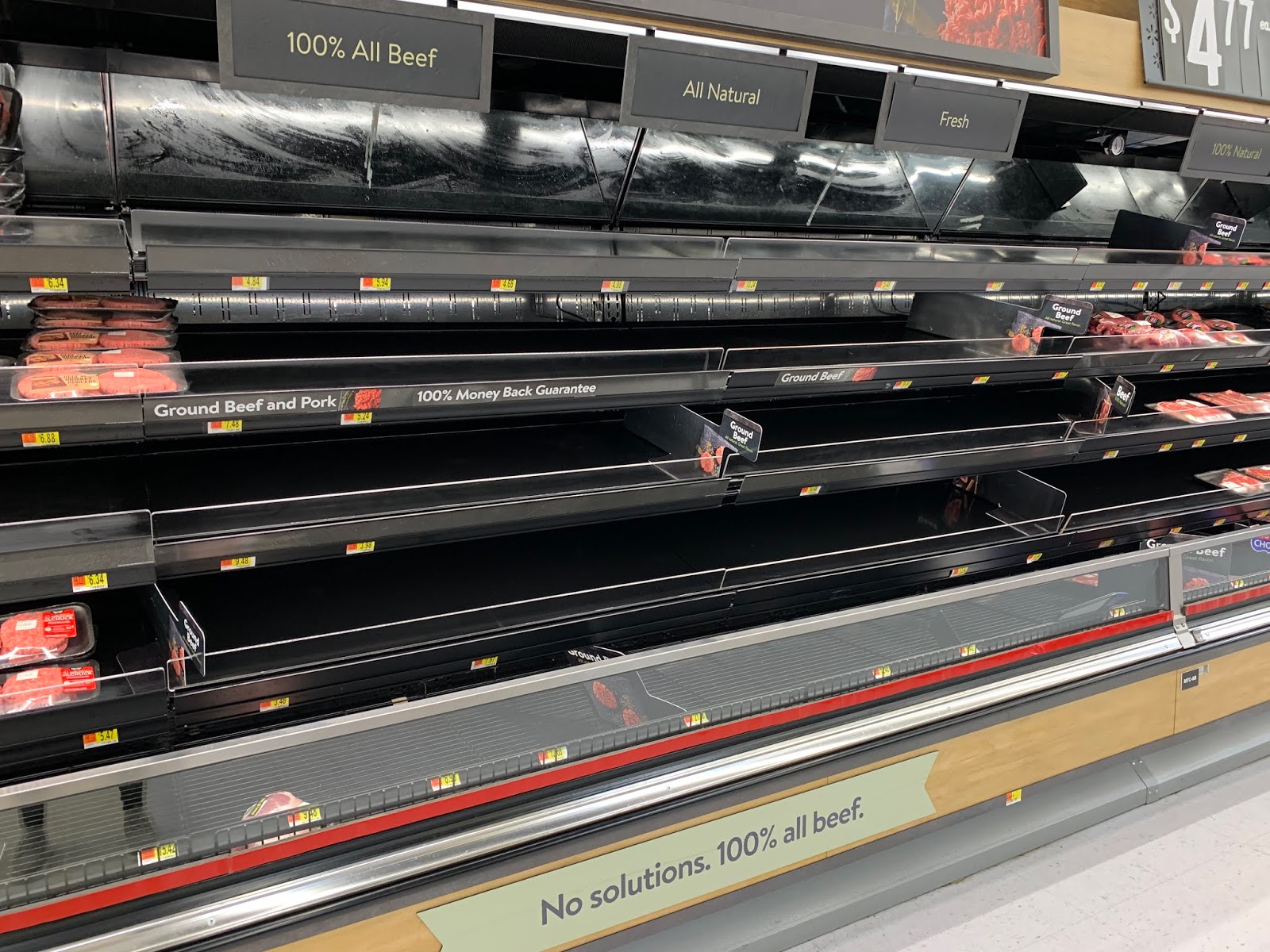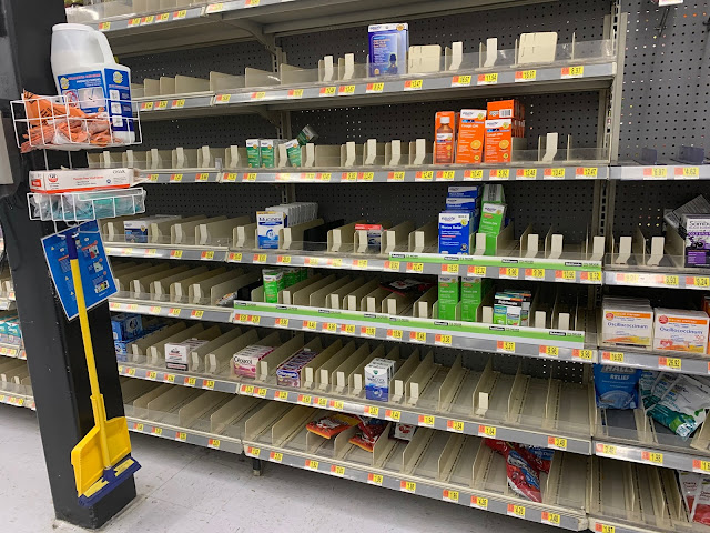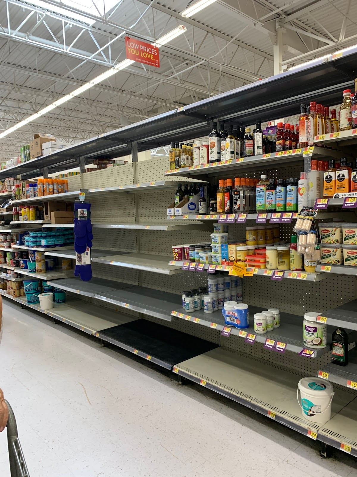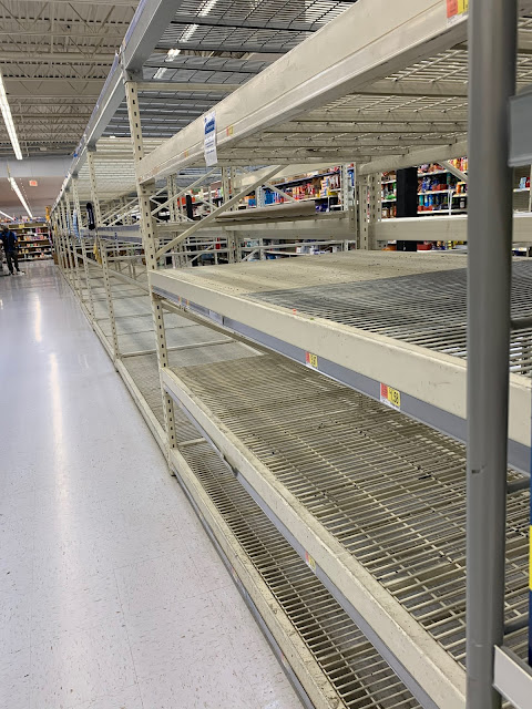 The shelves were so empty. It was surreal, like being in the twilight zone. We were able to find what we needed for the most part but had to settle for items that cost several times more than we would normally buy. Example, there were only 3 dozen eggs left at $6 per dozen. On our way to the front of the store, Chuck saw some regular eggs in someones basket.