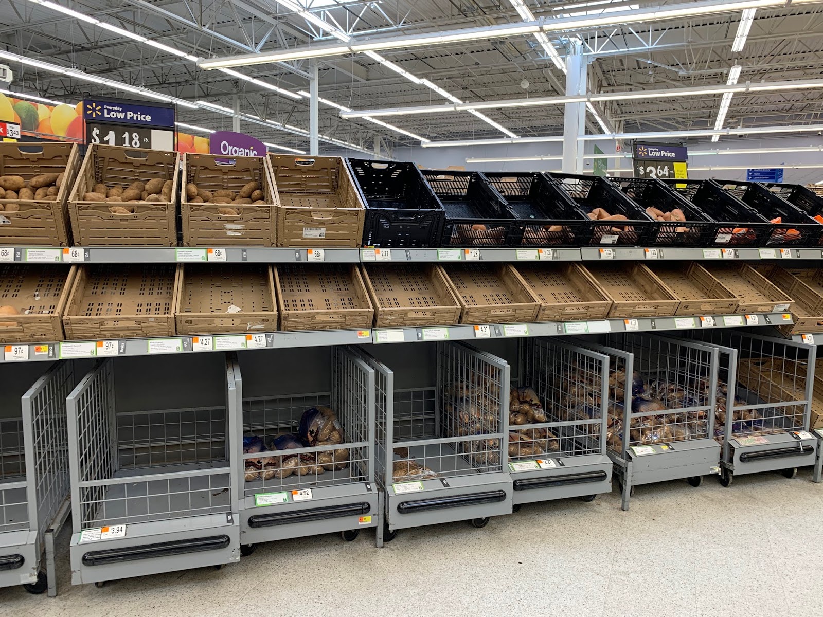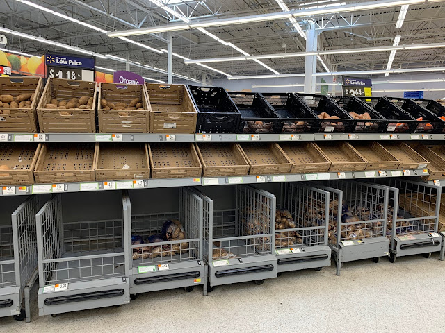 He asked the person where they got them and they said the stockers just put them out. Chuck hurriedly went to that section and picked up the $0.99 eggs and gladly gave back the gourmet $6 eggs. We picked up one of the last 2 loaves of bread and meat items, were 1 or two items on the shelf of each. Potatoes? only 2 bins left. The strangest thing we saw they were out of (other than the toilet paper) was cooking oil.