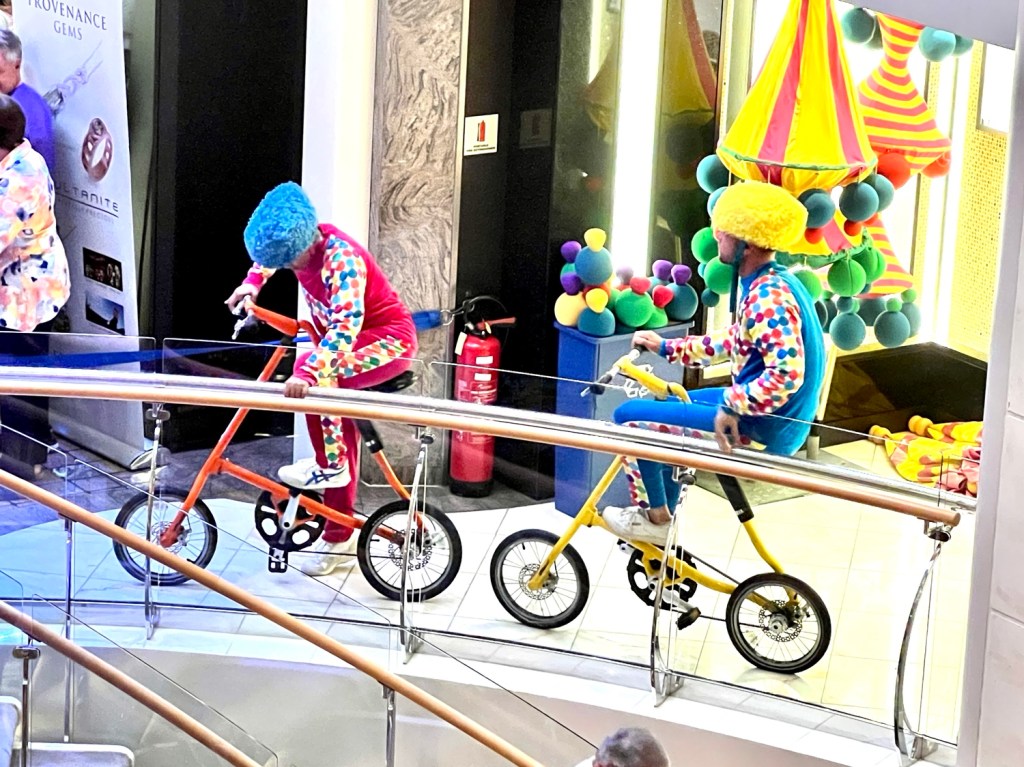 So, back to the ship. This is a midsize ship. Our favorite size. It has a promenade that has shops and restaurants and bars in the main floor. It’s like walking around town and window shopping. We found our way to the cabin, unpacked and we are now set for the next 29 days!