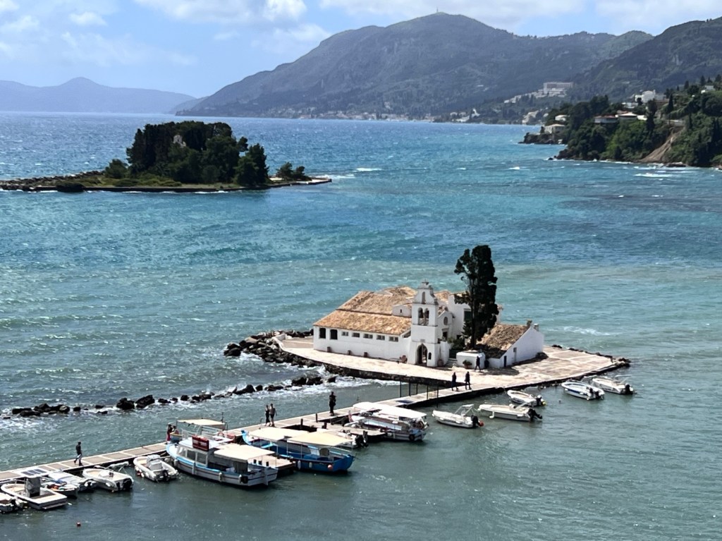 The Holy Monastery of Palagia is a 17th-century monastery located on the island of Pontikonisi. The monastery is dedicated to the Virgin Mary. It is known for its beautiful views of the surrounding area. We loved the view but couldn’t stay long.