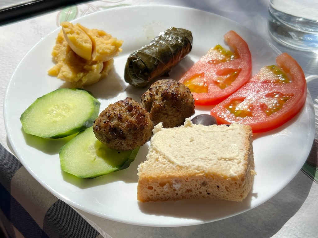 We had a stop for some Ouzo and mezes at a local restaurant. Greeks call restaurants a taverna. Ouzo is a very popular alcohol in Greece. Way too strong for me. I took a sip and after my face turned red with heat, I passed it over to Chuck! Mezes is a snack of hummus, olives, grape leaves, meatballs, pita bread or any variation of Greek snacks. Really tasty. I gave Chuck the meatballs, he gave me the olives.