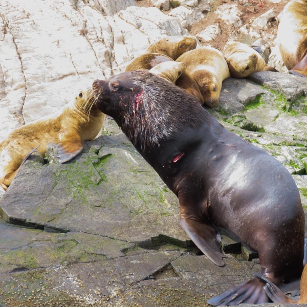 During the boat trip to the channel we saw sea lions galore! Boy did they smell. But watching them interact with each other was interesting to watch. Also a good resting and nesting spot for some birds. We believe we saw Rock Cormorant’s. They look almost like penguins but the difference is the birds can fly. We also saw a beautiful Upland goose. The sea lions were called 1 hair and 2 hair. Never heard that before but it was very easy to pick out the king of the kingdom here. He had recently been in a fight and blood running from his gashes. He was huge and you can tell why they are called Lions by their necks. They have a mane like a lion.