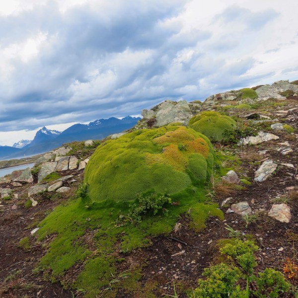 We stopped for a small hike to see some flowers, plants and of course more views of the mountains. We found some flowers and trees along the way. One was the Firebush. Very pretty red flowers. While walking we saw an orange round squishy thing on the ground. Not wanting to touch it, our friend Jane picked it up with two sticks to ask the guide. It was fruit from the tree. Totally edible, although we didn’t taste it, called Indian bread. The most important plant to their eco system was the Bolax gummifera. They are green mounds on the ground and are very hardy. You aren’t supposed to step on the small ones as they are still growing. So we tiptoed around them, trying not to fall on the sometimes very rugged terrain. But crossing over them and getting to the top of this ridge, the view was spectacular. This would be a great place for people that love to hike and camp and stay in the outdoors. The only thing you must like is cold weather. Leaves me out!