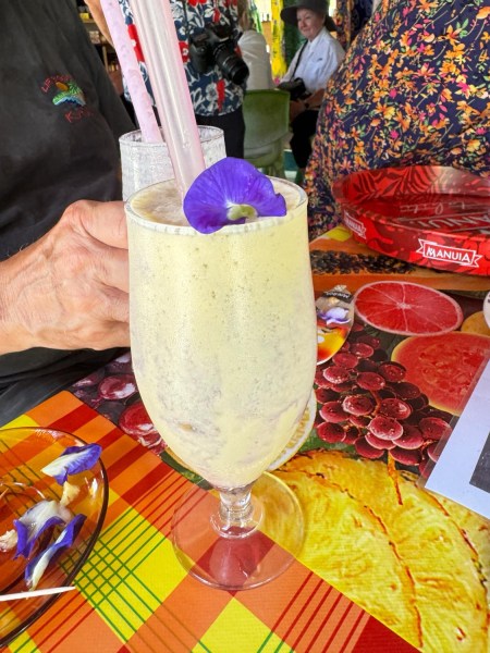On our way to the top we stopped for some delicious smoothies made with tropical ingredients. Papaya, pineapple banana and a purple edible flower called Clitoria. We had it in our drinks and our guide actually ate one. Turned his mouth dark purple. We didn’t try it.