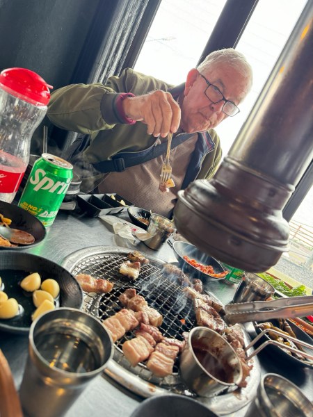 At the restaurant we had a traditional Korean barbecue. The table was laid out with the necessary tools such as chop sticks and lettuce wraps. We didnt use the chopsticks although Mark and Jane are pros. The chef’s came to our table, which had a fiery grill in the middle and laid out some marinated pork. The meat sizzled and smelled so good as we flipped and cut the meat to bit sized pieces. The smoke filled the air and our hair and faces. There is a fan dropping from the cieling of each table to whisk away the smoke but not all of it. The guide said it only blows toward beautiful women. Ok, you got me there! Lunch was fantastic and soon we had to leave to get back to the ship before they left us.