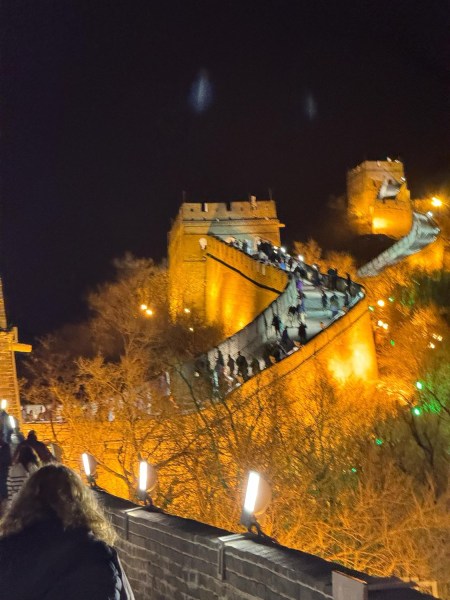 The nighttime experience for us was available at the Badaling section: This is the most well-known and heavily restored section of the Great Wall. The nighttime experience was just spectacular. Floodlights illuminate the wide, restored walkways, making it easier to see but with enough shadows to have an exciting nighttime adventure.