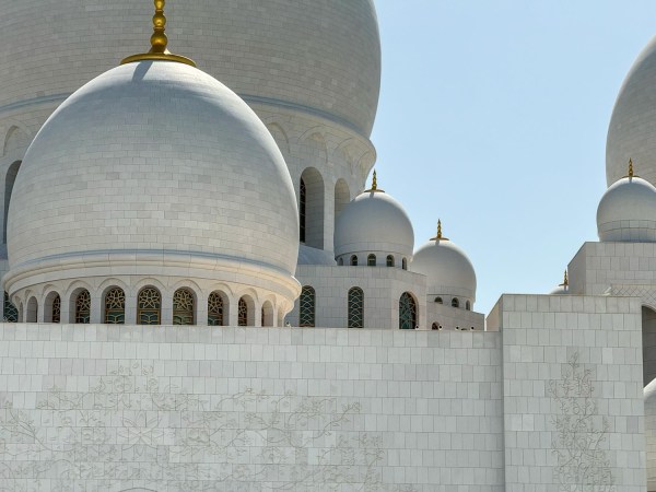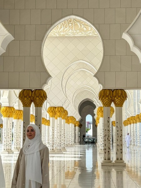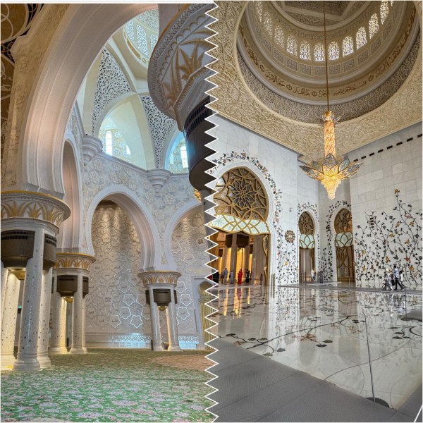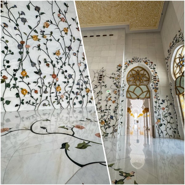 The mosque itself is a feast for the senses. Intricate floral courtyards, the world’s largest marble mosaic, and a sky dotted with 82 dazzling white domes – all bigger and better than anything we’d seen before. Inside, the prayer halls shimmered under the glow of 24-carat gold chandeliers. No wonder the security was everywhere!